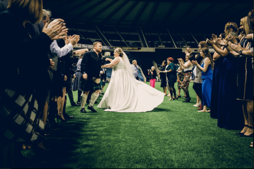 5 years ago Rachel and Neil tied the knot in the historic Edinburgh church where Rachel is a Girl Guide leader. The wedding reception was held at Murrayfield Stadium as a representation of where Scotland and Wales usually meet on the pitch. As the evening progressed so did the dancing which took to the pitch (see below) for ceilidh dancing. We knew those Welsh country dancing lessons would come in handy one day!